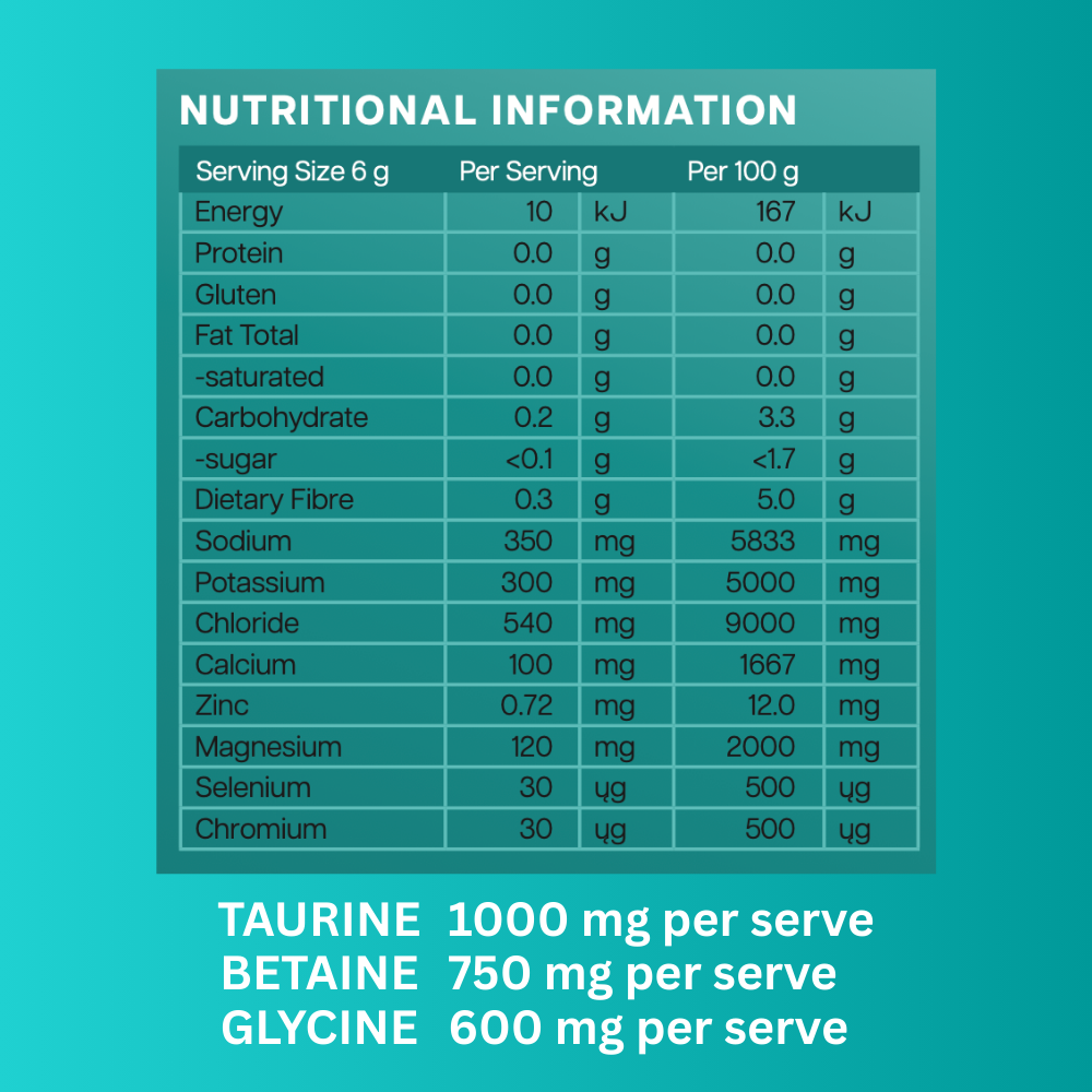 Betaine (750mg per serving) - an osmolyte that supports intracellular hydration and methylation - two overlooked but critical processes for performance and daily balance.